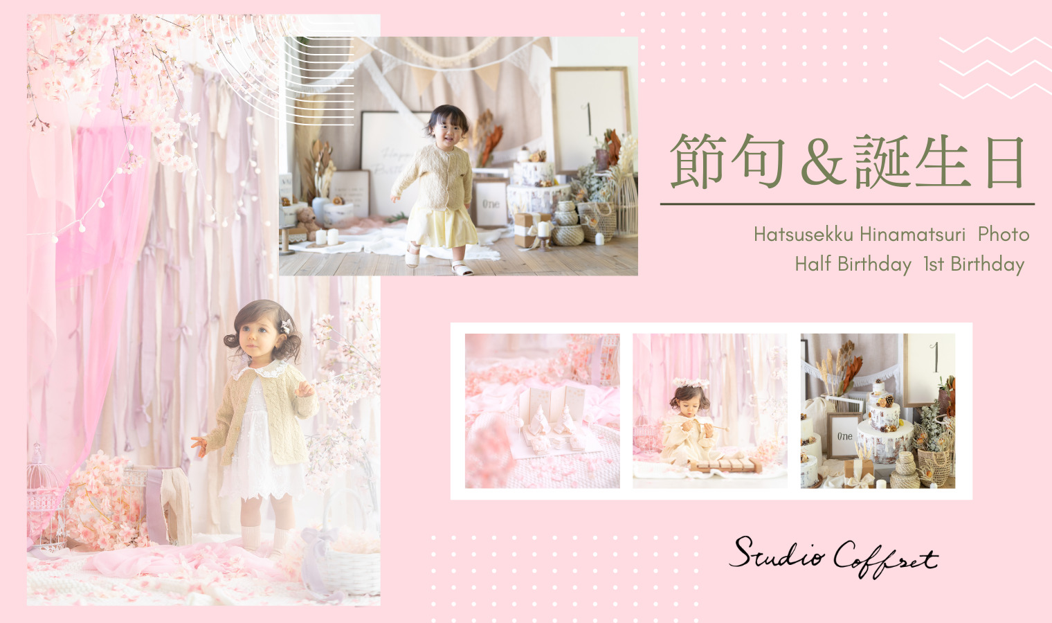桜色の可愛らしいスタジオセットは今しかないお子様のあどけなくて愛らしい表情を引き出し優しい写真を残せるセットになってます。