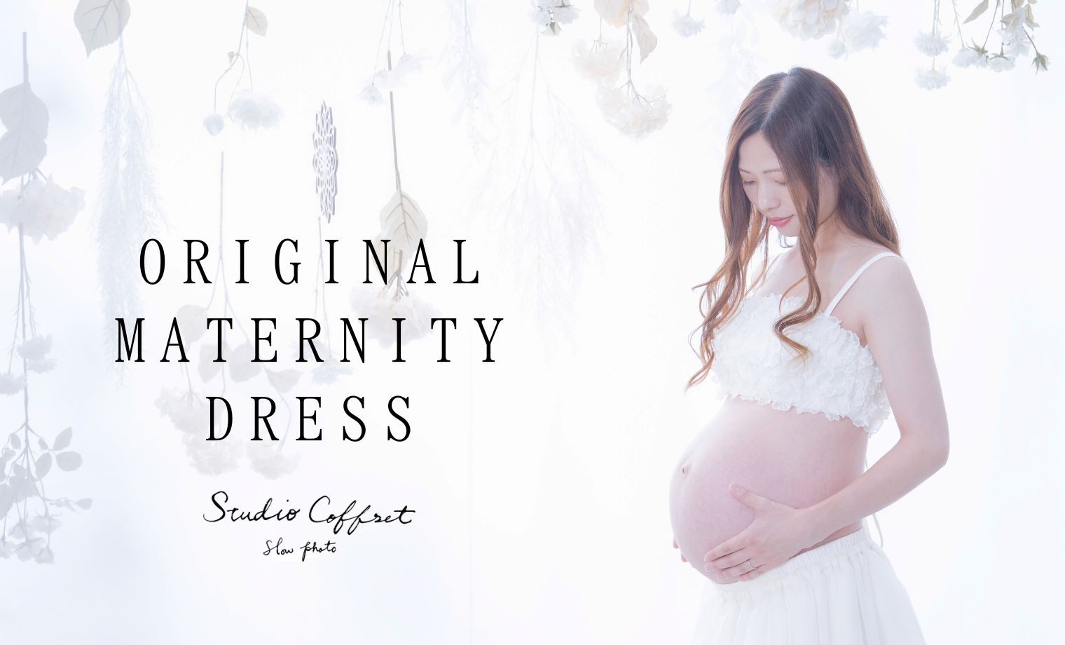 スタジオコフレの新作マタニティドレスを着た撮影で、おなかの中のお子様との初めての家族写真を残しましょう!