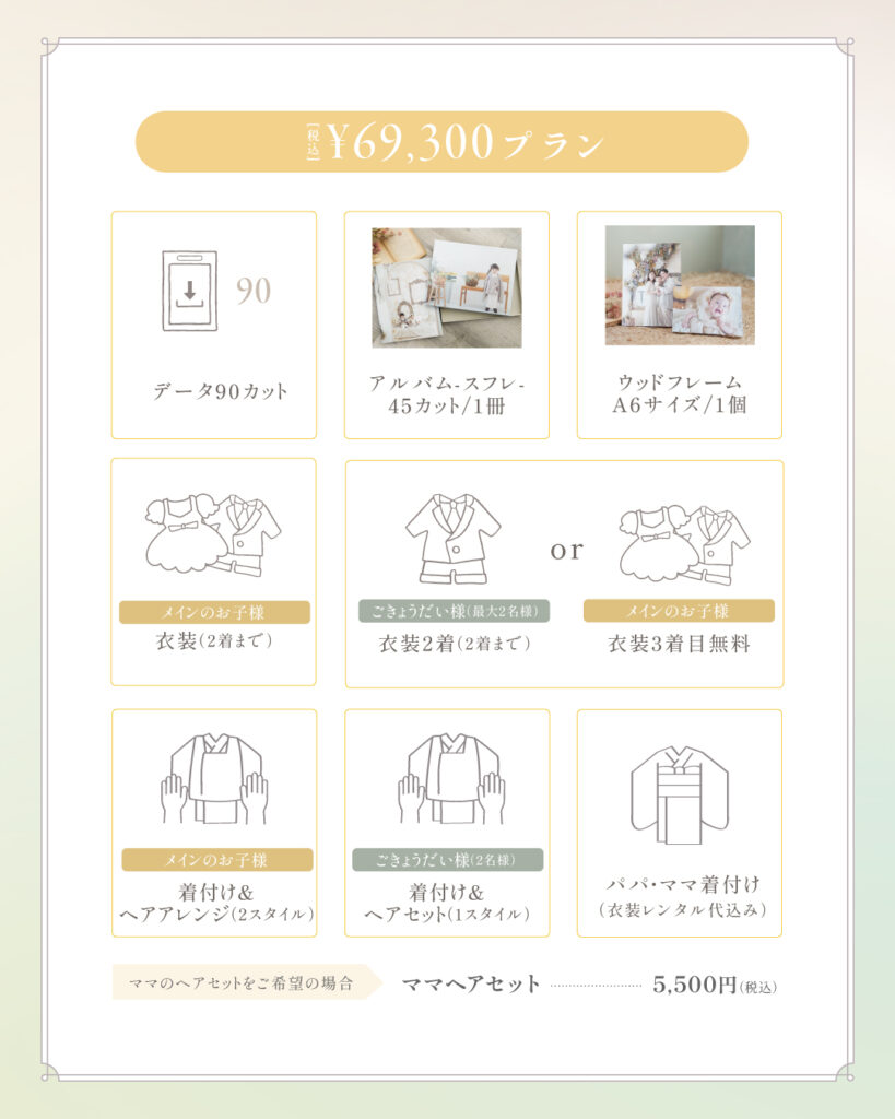 あらかじめごきょうだいの着付け・パパママの着付け・衣装レンタル料や、アルバム・フレームもついてきます!