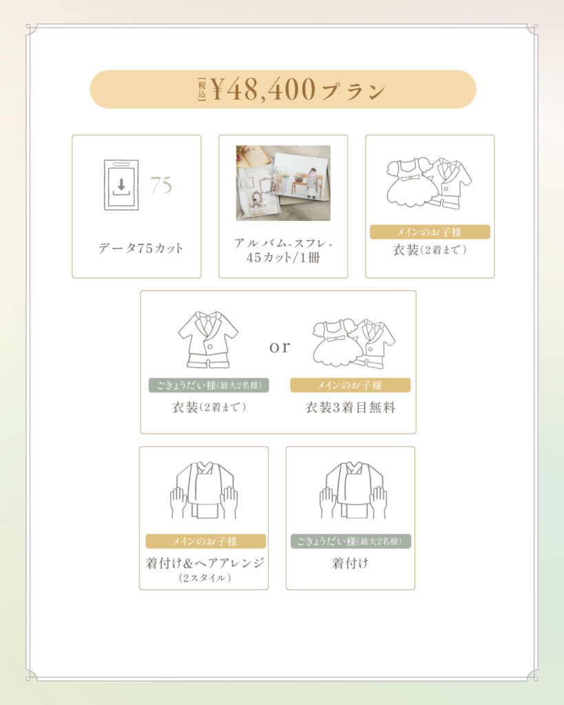 ・きょうだい衣装2着付き(最大2名様)orメインのお子様衣装3着目無料