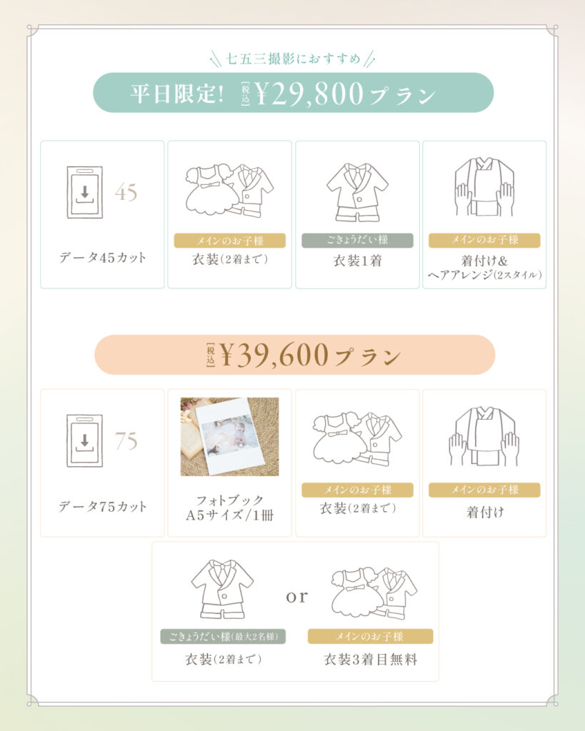 平日限定の29,800円(税込)プランには、メインのお子様の着付け・ヘアアレンジ料、データ45カット、衣装2着が全部含まれています!