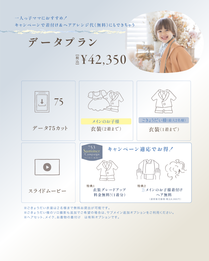そのほかにも、お子様の着付け・ヘアアレンジ無料やデータ10カット追加もお選びいただけます。