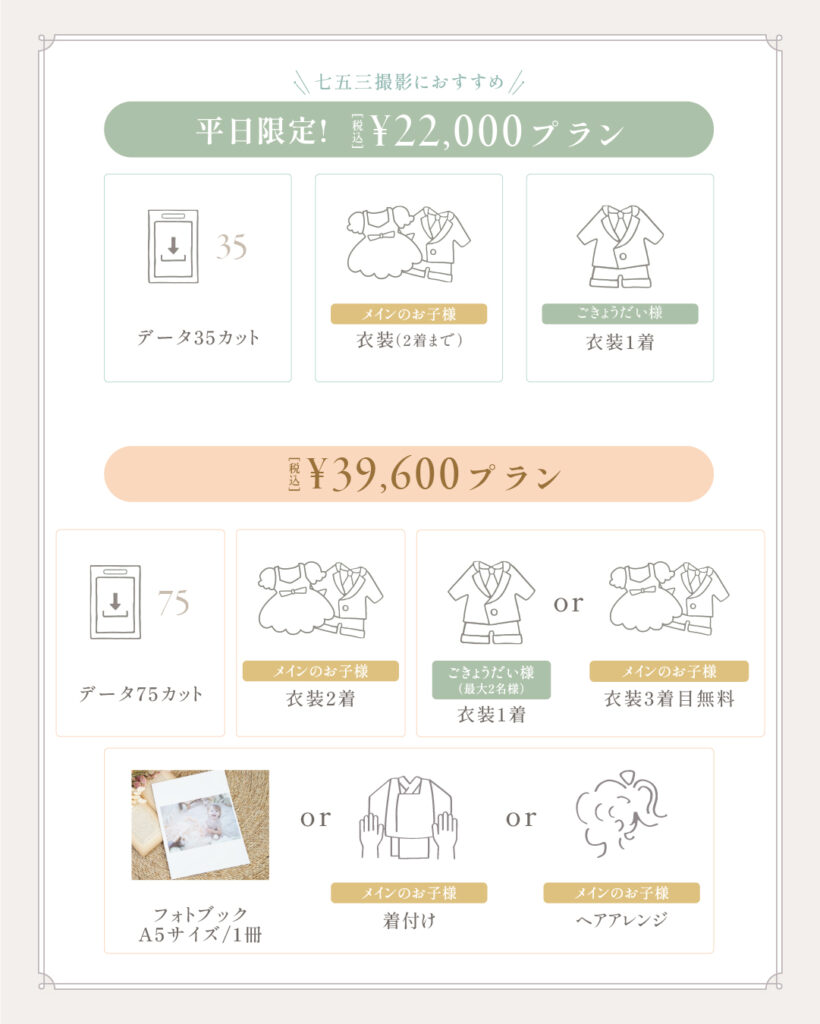 ・きょうだい衣装1着付き(最大2名様)orメインのお子様衣装3着目無料
