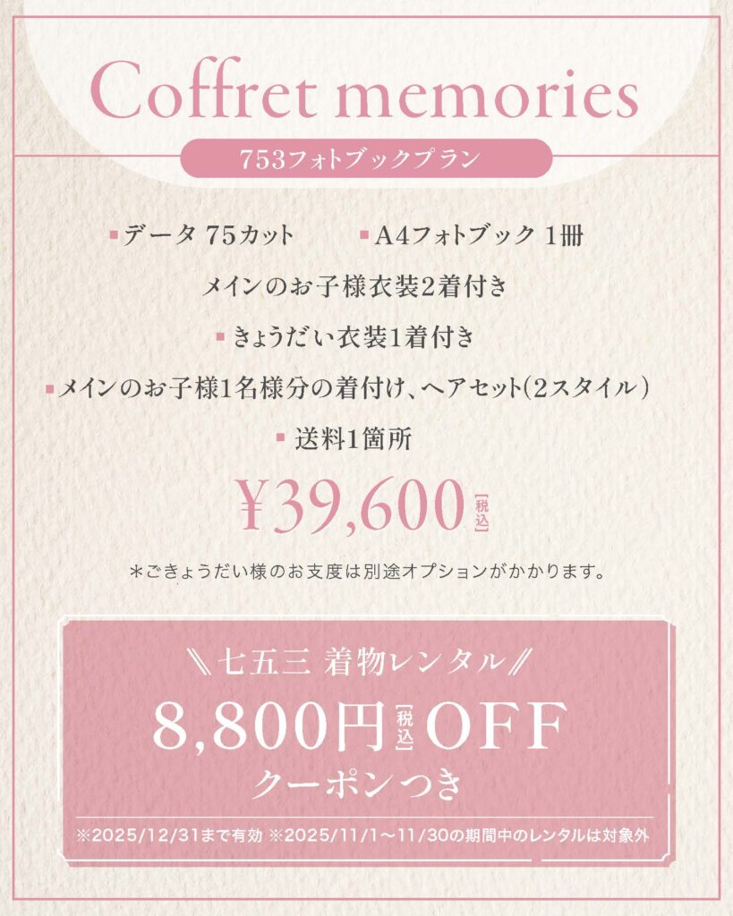 ご予約時に船橋津田沼スタジオで「七五三早期予約限定プラン」をご希望とお伝えください。