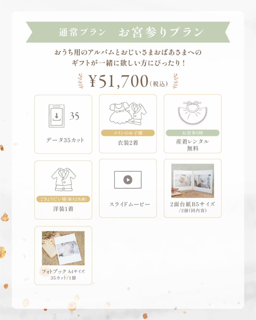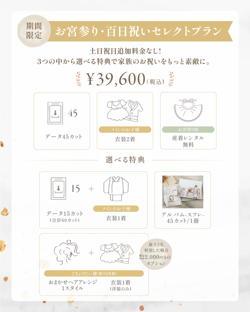 ※宮参り・百日祝い撮影の双子のお子様に関してはサブメイン追加可能です。