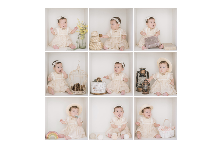1枚に9個のお子様の表情が収められ、可愛さがギュッと詰まったお写真が作れます。