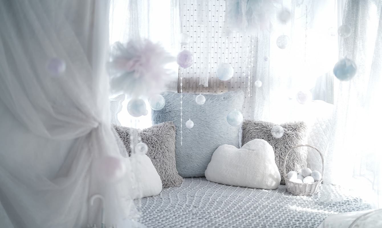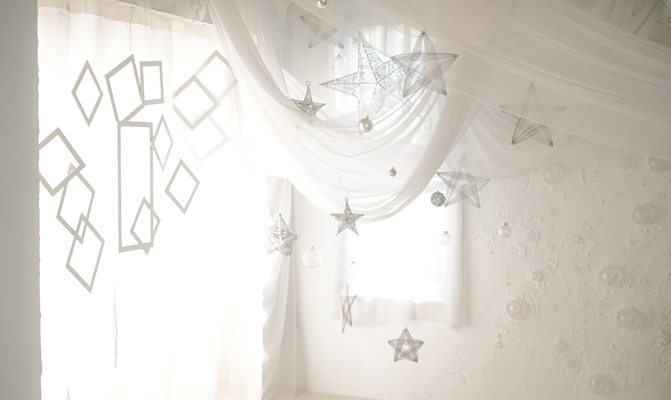 [yuki] では、ソフトで真っ白な空間に雪のような美しいひかりが照らします。[hare] は、木漏れ日のような太陽のひかりがたっぷり差し込むあたたかな空間。[ame] は雨粒のようにキラキラと輝く小さなひかりが幻想的な世界を創り出し、[kumo] はふわふわのモチーフと、レース越しの柔らかいひかりに包まれるナチュラルな世界が広がります。