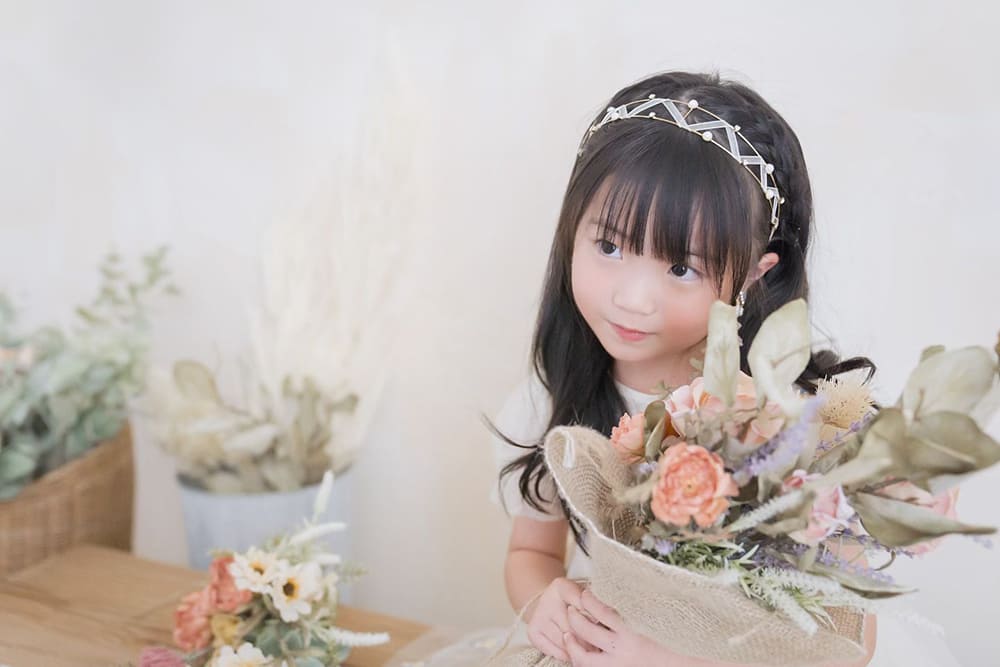 スタジオコフレが大切にするのは「その子らしさ」を引き立たせること。派手なヘアメイクではなく、1人1人に合うヘアセットを地毛でセットいたします。撮影中に髪飾りや帽子などの小物アイテムで変化をつけながらトータルコーディネートをいたします。