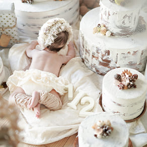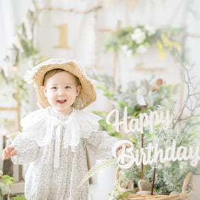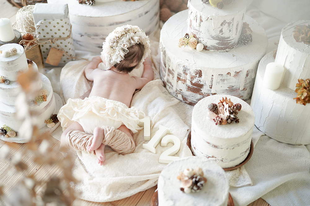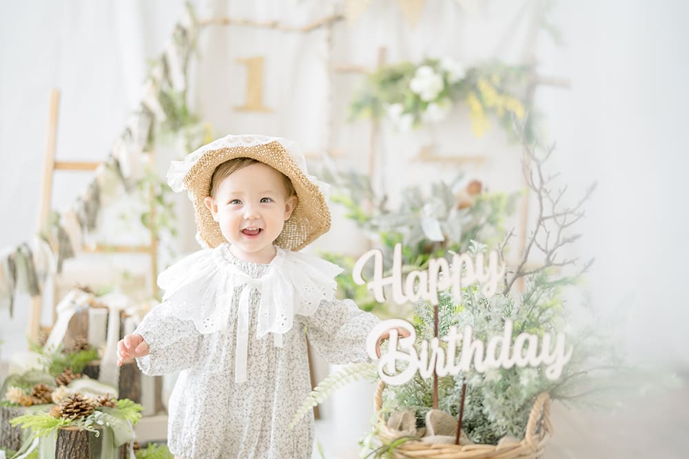 1歳を迎えたことをお祝いする誕生日撮影。スマッシュケーキや選び取りカードで特別な思い出に。