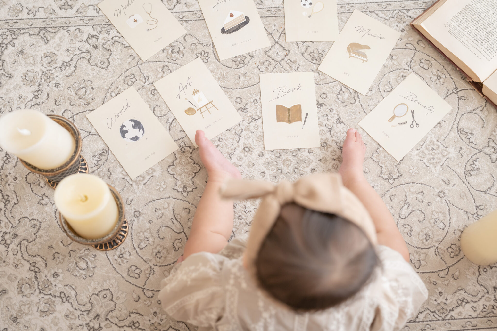 「選び取り」とは、赤ちゃんの1歳の誕生日に行う伝統行事のひとつです。赤ちゃんの前に品物やカードを並べ、そのチョイスをもとに将来を占います。お子さまのお誕生日に特別な思い出を作るために、ぜひ取り入れたい行事のひとつです。